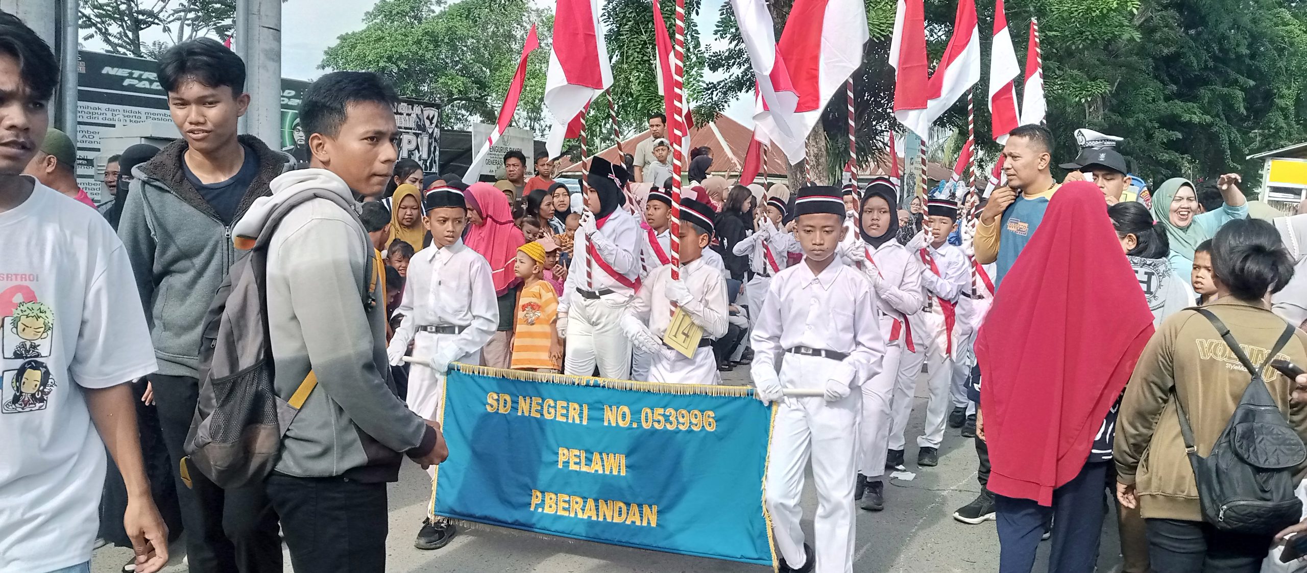 Siswa siswi Sekolah Dasar Negeri 053996 Pelawi hadir dan meriahkan acara Hari Peringatan Bumi Hangus Pangkalan Berandan ke-78 di lapangan sepakbola Kampung Baru Kelurahan Berandan Timur Baru Kecamatan Babalan Kabupaten Langkat Sumatera Utara, Rabu ( 13 / 8 / 2025 ).