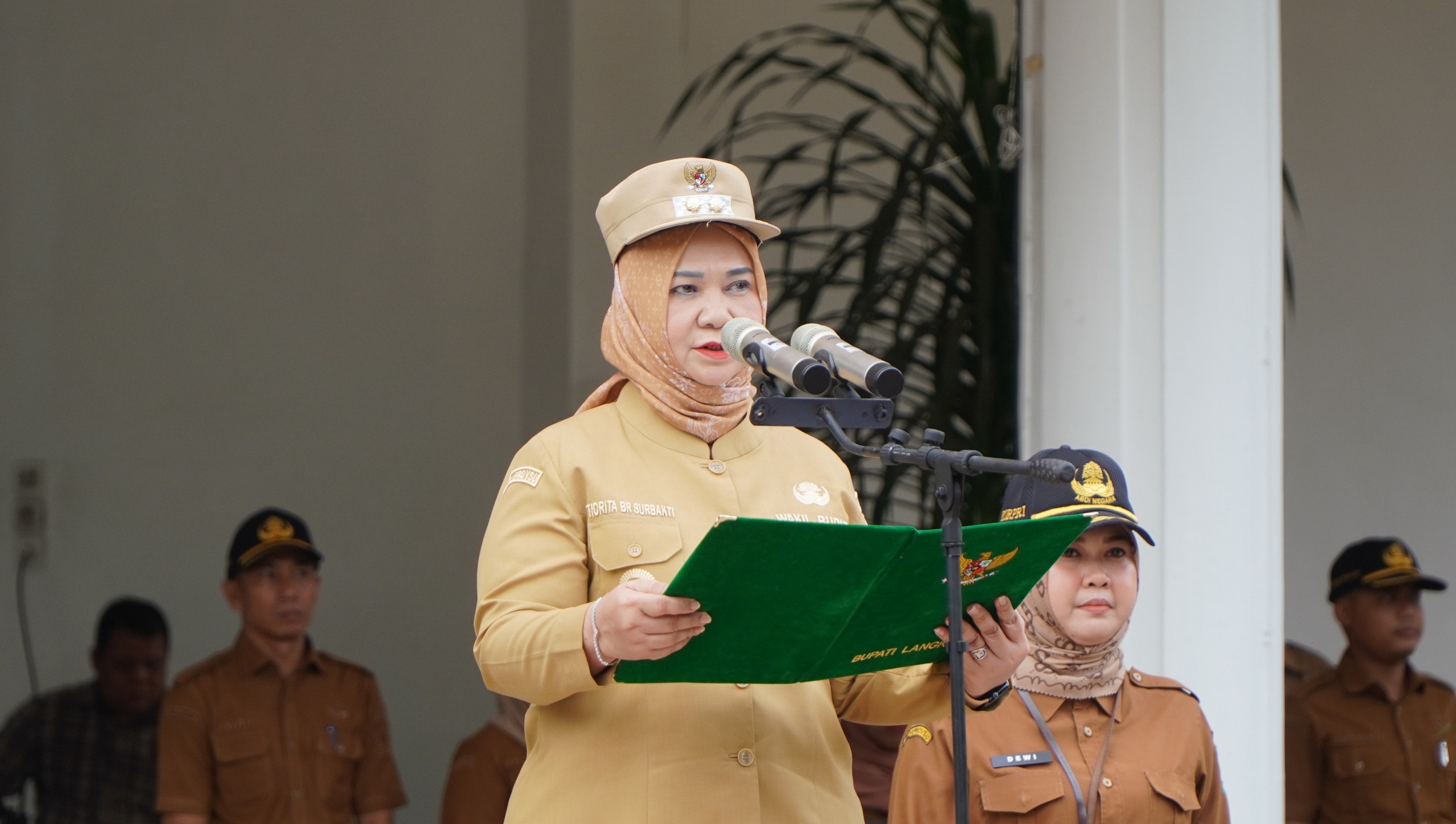 Bupati Langkat H. Syah Afandin, SH yang diwakilkan Wakil Bupati Langkat, Tiorita Br Surbakti, memimpin apel pagi di halaman Kantor Bupati Langkat, Senin (8/9/2025).