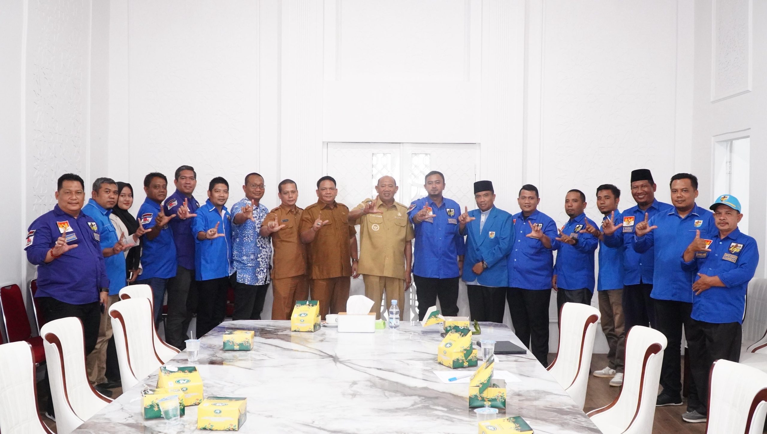 Bupati Langkat H. Syah Afandin, SH menerima audiensi pengurus Komite Nasional Pemuda Indonesia (KNPI) Kabupaten Langkat di ruang kerjanya pada Selasa (14/10/2025).