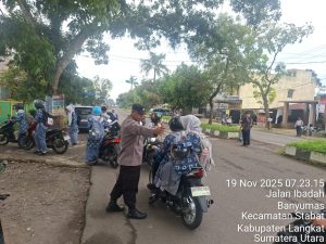Untuk memastikan kelancaran arus Lalulintas 200 Personil Polres Langkat dan jajaran melaksanakan pos padat pagi (strong point) di Wilkum Polres Langkat, Rabu (19/11/2025). 07.00 WIB.